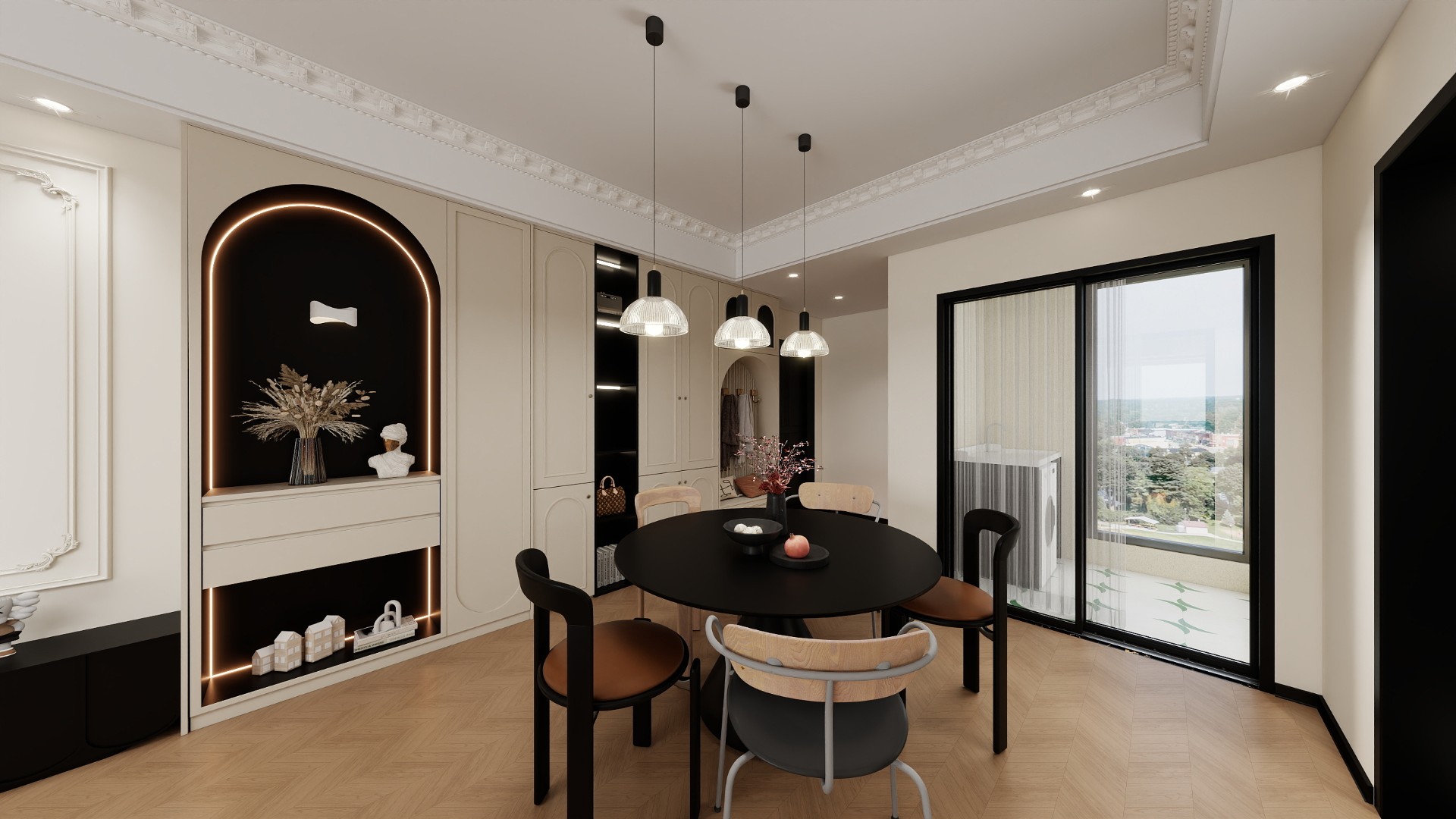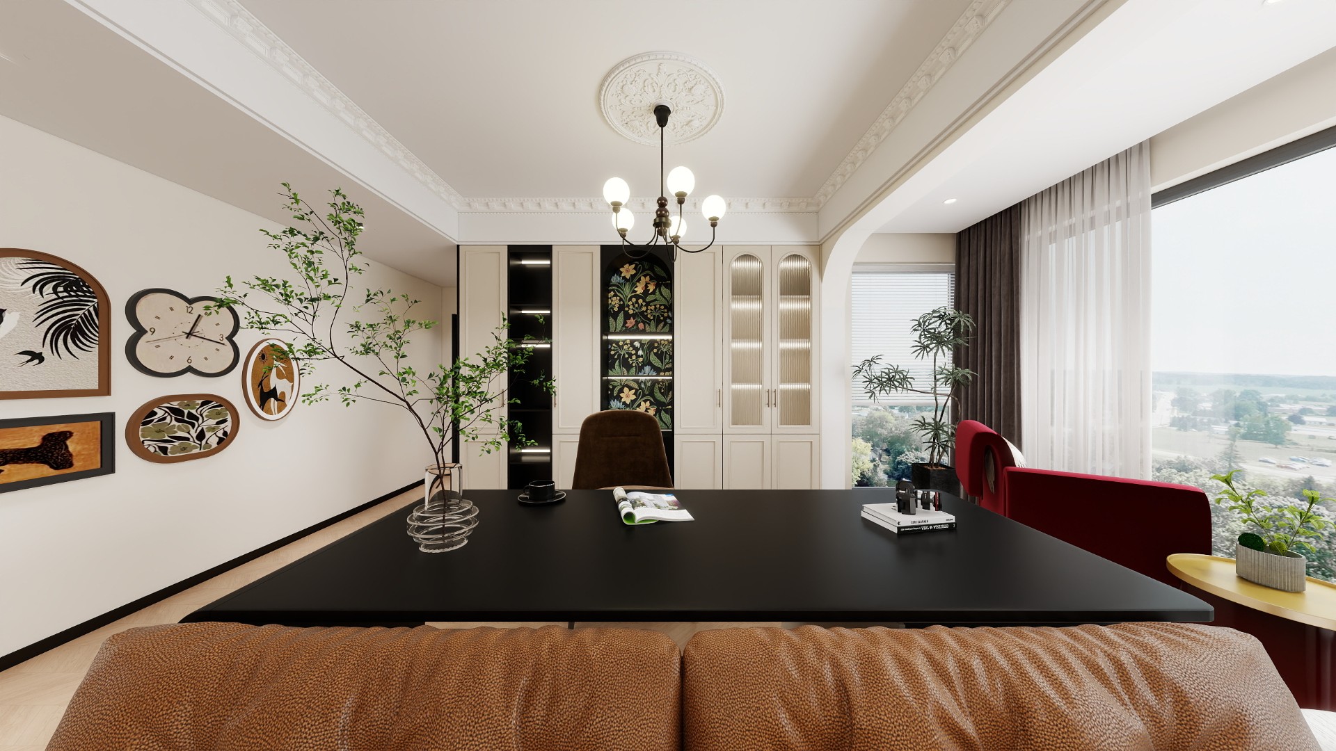 打破傳統(tǒng)套三的局促感,利用橫廳的開闊優(yōu)勢(shì),讓法式復(fù)古的優(yōu)雅從視覺(jué)延伸至空間體驗(yàn),既滿足單人或雙人居住的舒適需求,又通過(guò)細(xì)節(jié)復(fù)刻(如復(fù)古門型、銅制擺件)傳遞經(jīng)典美學(xué),實(shí)現(xiàn)“大空間+小精致”的復(fù)古生活場(chǎng)景。