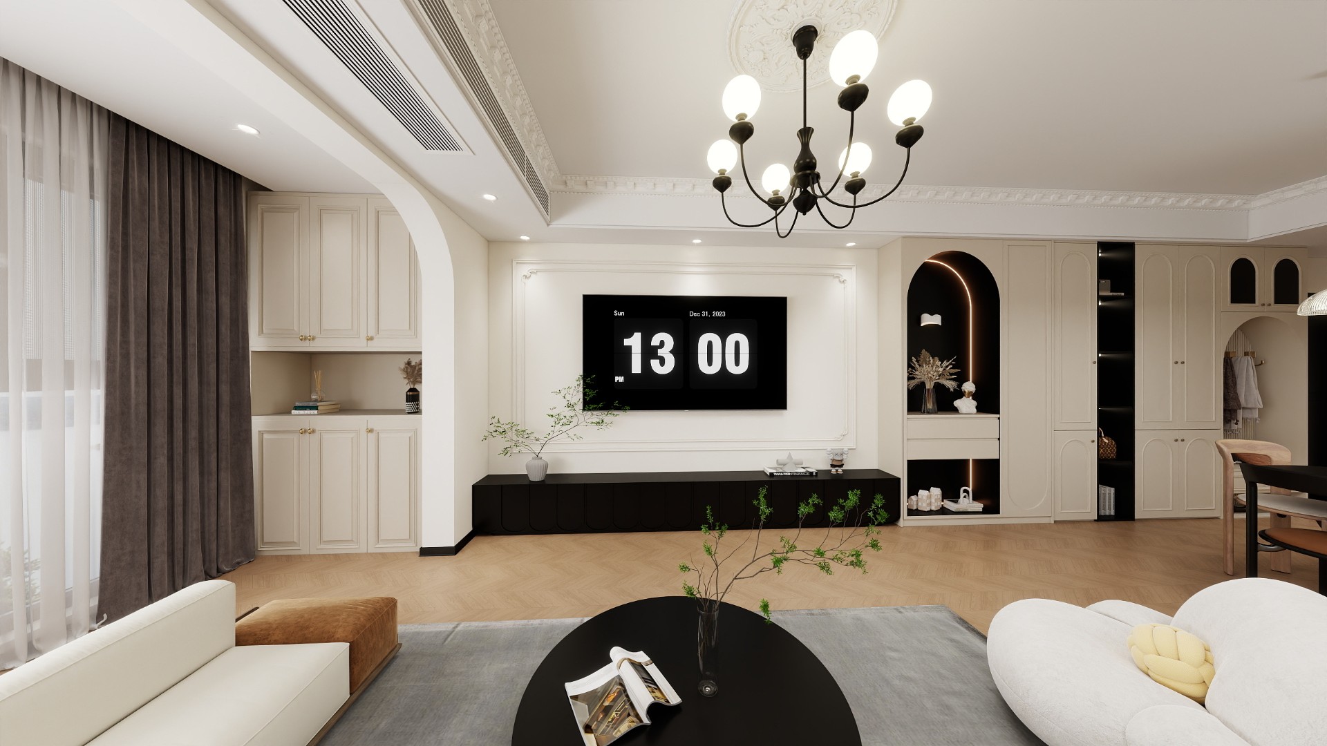 設(shè)計(jì)說(shuō)明:將原套三格局打通整合為套一,以橫廳為核心承載客、餐、休閑等復(fù)合功能,通過(guò)開放式布局放大空間尺度,同時(shí)保留法式復(fù)古的浪漫儀式感,讓復(fù)古美學(xué)與現(xiàn)代生活需求深度融合。