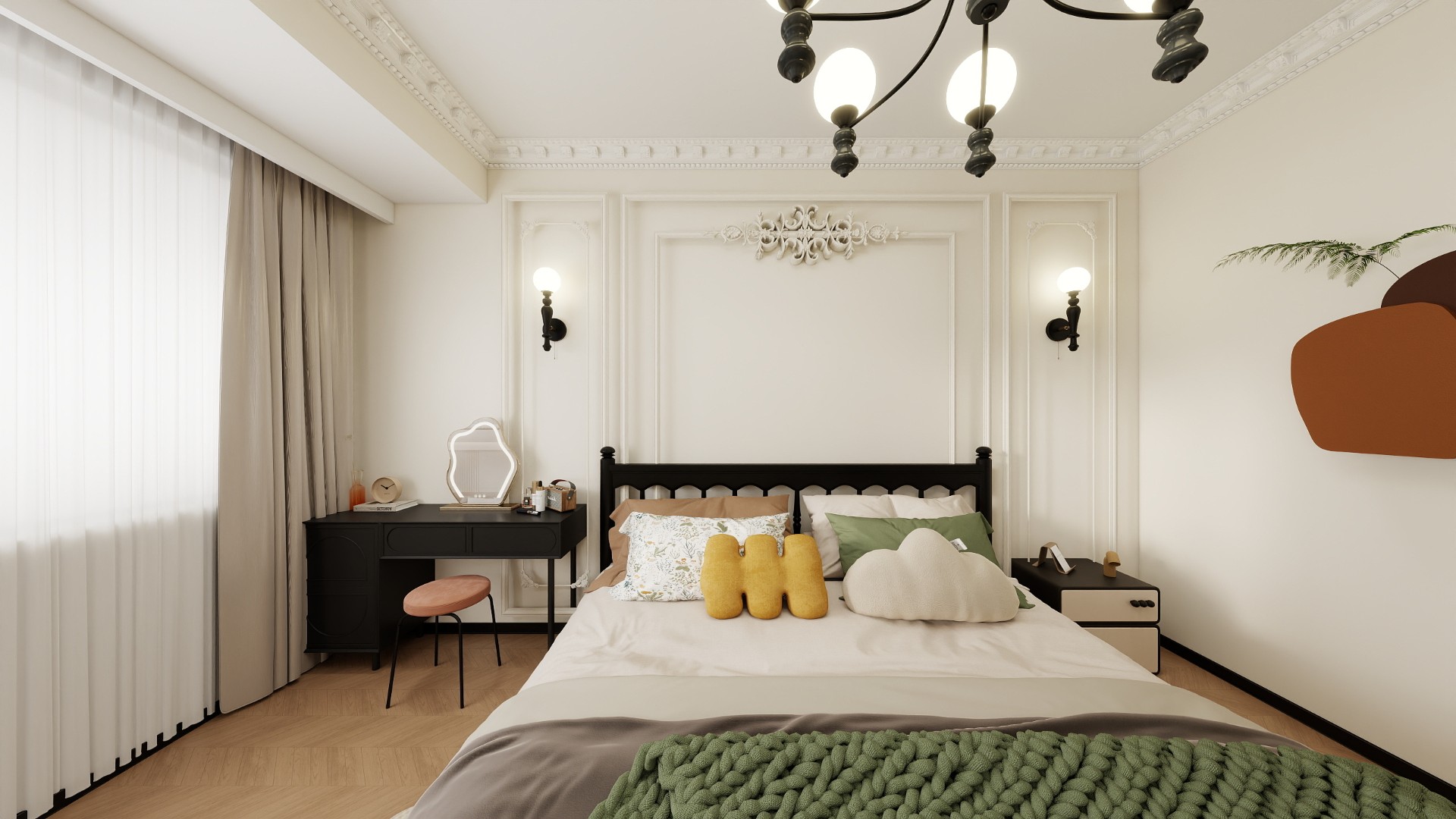 色彩與材質(zhì):主色調(diào)選用奶油白、淺灰綠、復(fù)古紅等低飽和色系,地面通鋪人字拼實(shí)木地板或仿石磚,局部鋪設(shè)復(fù)古花磚作為區(qū)域劃分;家具優(yōu)選實(shí)木雕花、絲絨布藝、黃銅五金等元素,如弧形沙發(fā)、雕花餐桌、金屬吊燈,強(qiáng)化復(fù)古質(zhì)感。